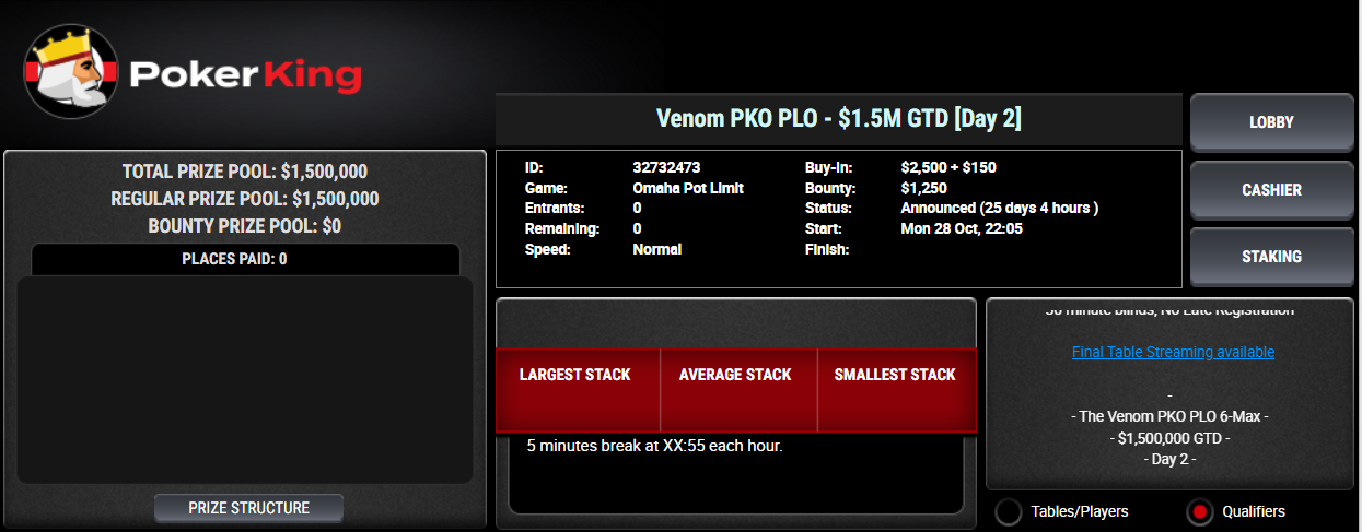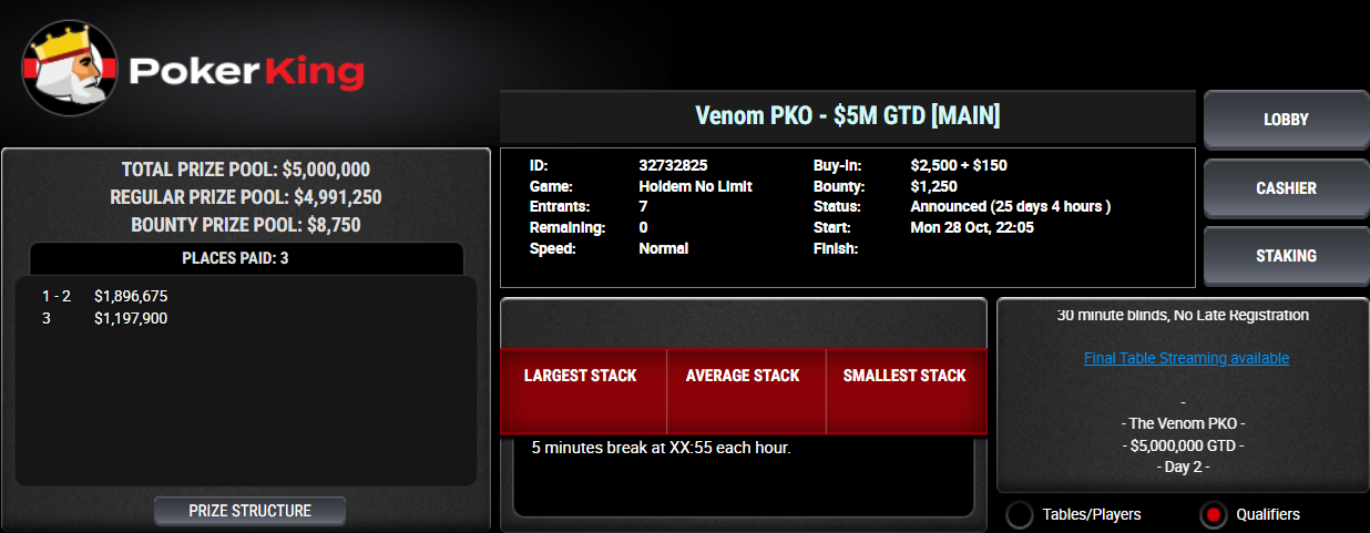 С 13 по 31 октября на PokerKing пройдёт Venom NLH PKO с бай-ином $2,650 гарантией $5,000,000. У него 5 флайтов — они стартуют: