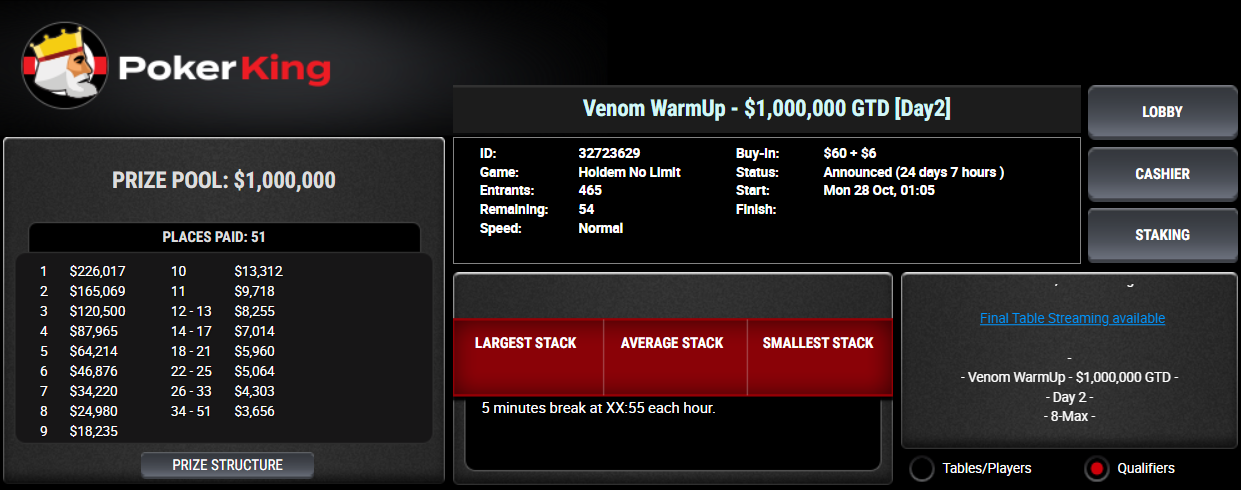 С 1 по 27 октября на PokerKing проходит «разогревочная» версия Венома — $66 Venom WarmUp $1M Gtd — в мультифлайтовом формате. Попасть в него можно через сателлиты от фрироллов.