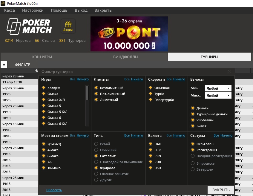 С 3 по 26 апреля в руме PokerMatch проходит серия нокаут-турниров PKO PONT, с общей гарантией $354K. Всего запланировано 129 событий по Холдему, Омахе и Китайскому Покеру за 3, 6 и 9-max столами. В них установлен единый бай-ин — 550 гривен ($20).