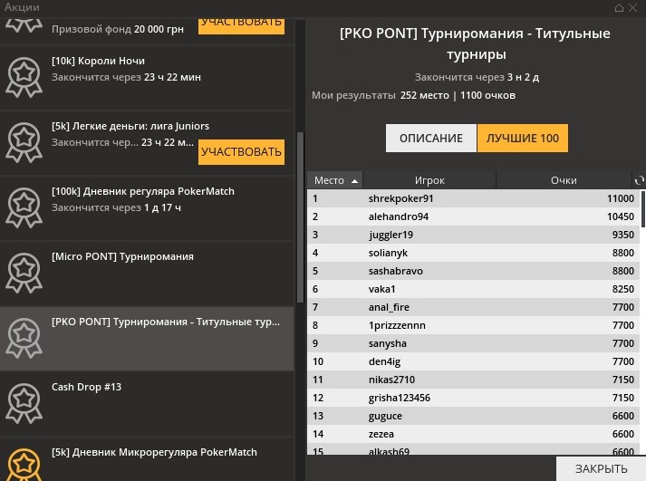 Отслеживать свой прогресс по обоим лидербордам можно в лобби PokerMatch в разделе «Касса» -> «Акции».