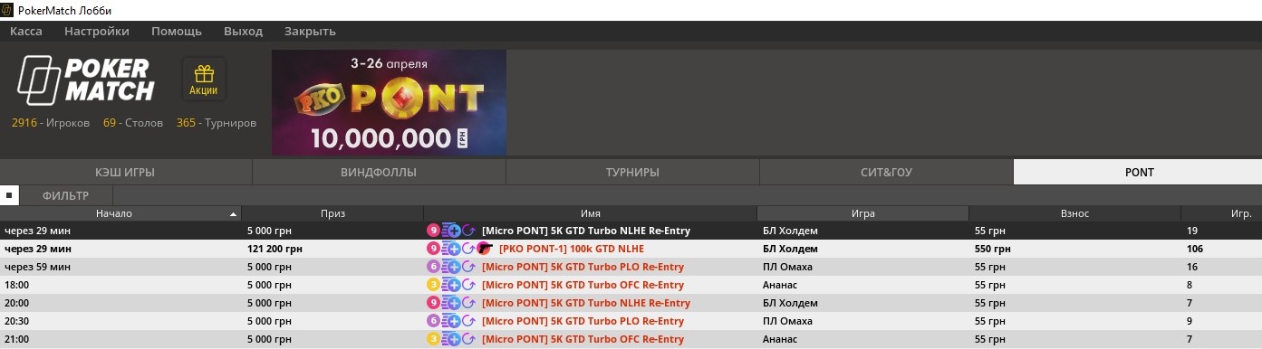 Гарантии ежедневных турниров варьируются от $880 до $6K. Найти турниры можно в лобби рума в тематической вкладке PONT — они стартуют каждый день в одно и то же время с 15:00 МСК с разницей в 1 час.