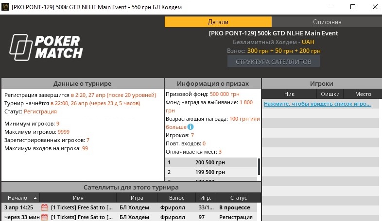 - Открыть интересующий вас турнир и посмотреть в информации к нему доступные сателлиты. Выбрать подходящий по времени и бай-ину сателлит и зарегистрироваться.