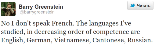 «Я не говорю по-французски. Языки, которые я изучал (в порядке степени владения, начиная с самого лучшего): английский, немецкий, вьетнамский, кантонский [диалект китайского] и русский.»