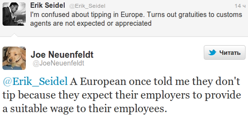 - Я в небольшом замешательстве насчёт чаевых в Европе. Сотрудники таможни, например, не ожидали и не оценили их. - Один европеец как-то раз сказал мне, что у них не принято давать на чай, потому что считается, что работодатель должен обеспечивать своих сотрудников достойными зарплатами.