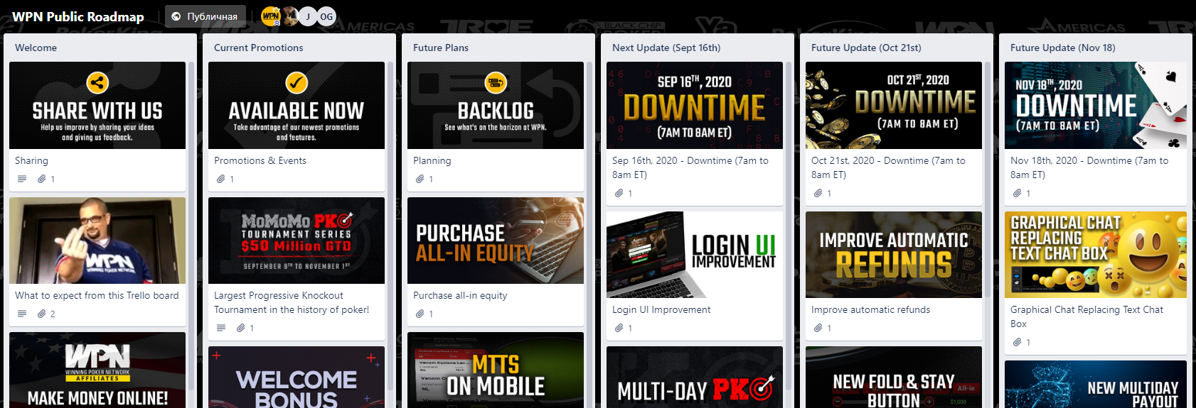 Можно сказать, что WPN «подсмотрели» идею с роадмапом у GGПОКЕРОК, которые ведут подобную карту уже не один год, за что им огромное спасибо. На самом деле, подобная практика (не обязательно в Трелло) должна в скором времени стать стандартом индустрии.