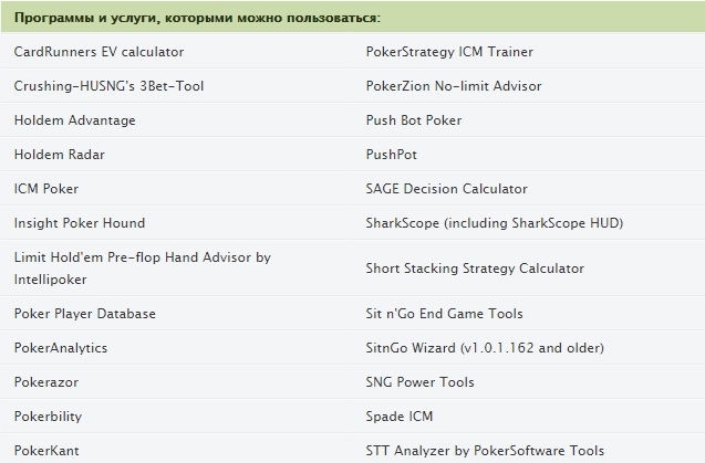 «Как такового списка вспомогательных программ нет, как и запрета на использование таких программ при включенном или выключенном покерном клиенте. В нашем руме разрешены любые вспомогательные программы».