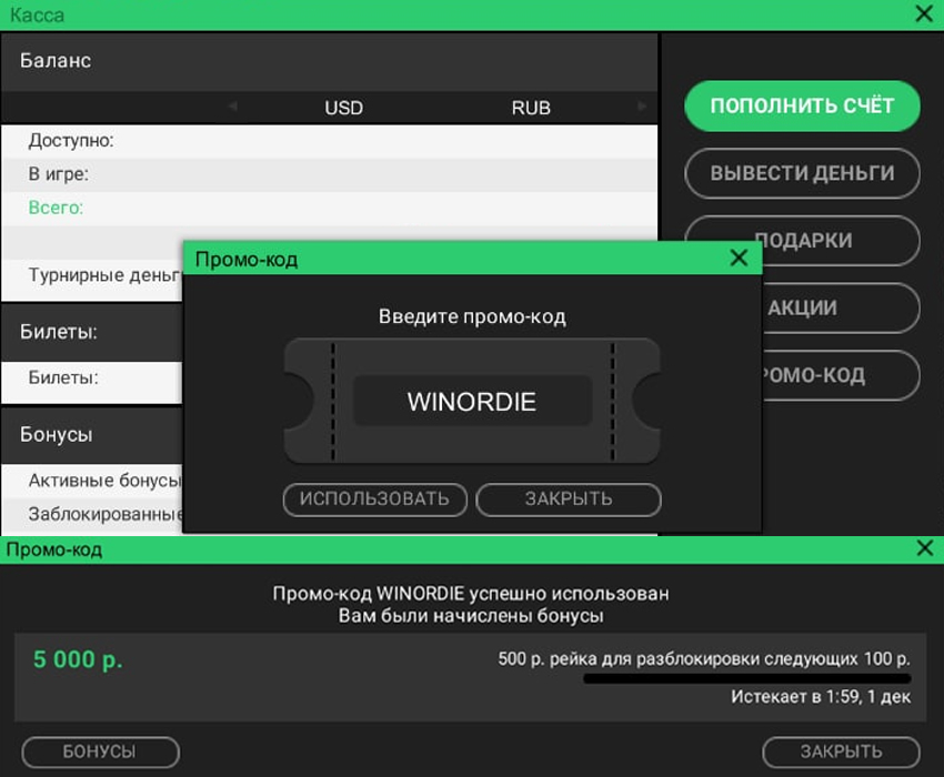 Для активации бонуса нужно зайти в лобби рума —> Касса —> ПРОМО-КОД —> вбить код WINORDIE —> нажать «Использовать».
