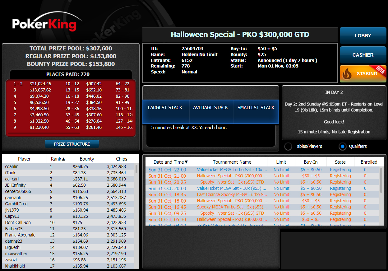 В ночь с 31 октября на 1 ноября в 00:05 МСК на PokerKing стартует особый мультифлайтовый PKO-турнир — $55 Halloween Special $300K Gtd. Флайты стартуют в течение дня с 24 по 31 октября — структура у них одинаковая: