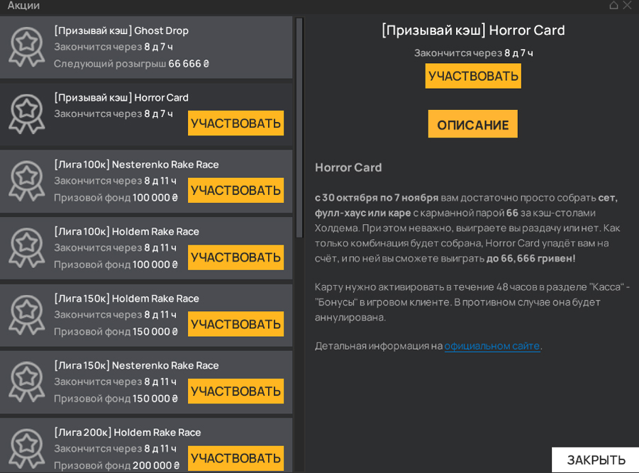 Для участия в акции «Horror Card» нужно зайти в лобби PokerMatch —> Акции —> [Призывай кэш] Horror Card —> нажать «Участвовать». Без этого комбинации не будут засчитываться.