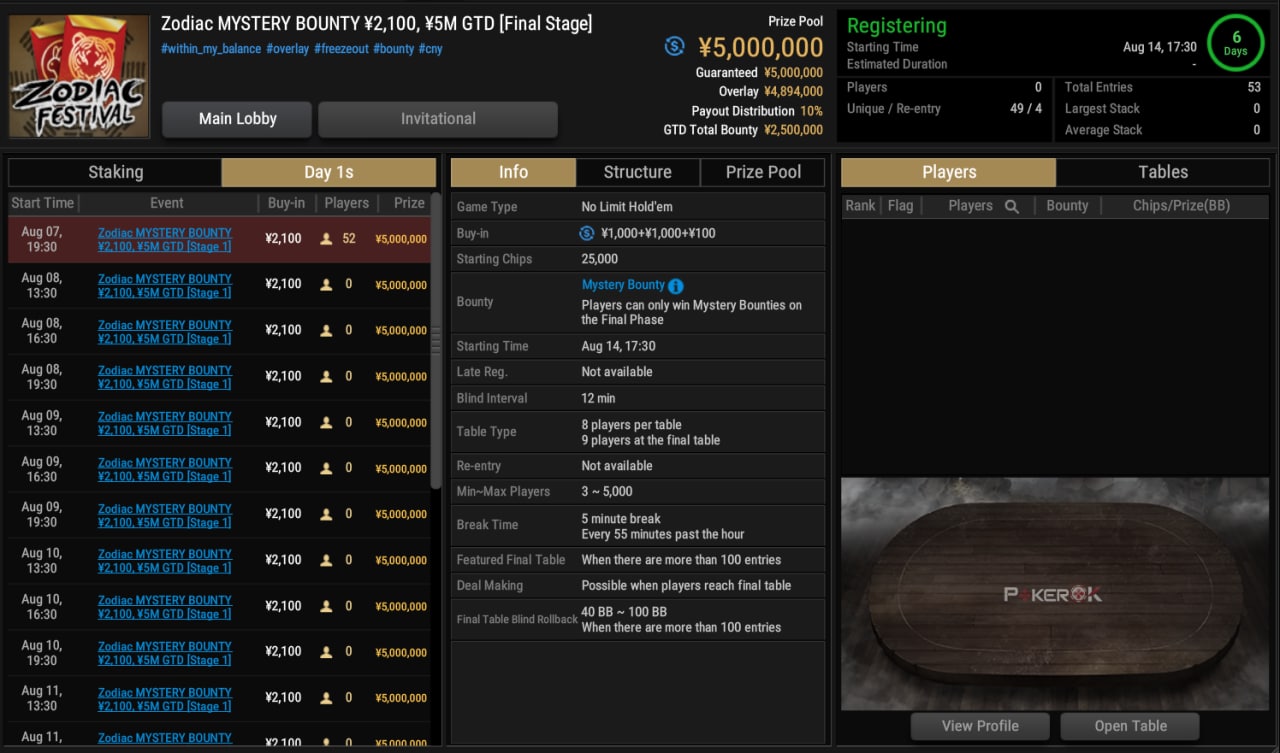 Последние серийные турниры Mystery Bounty в сети GGNetwork на момент выхода статьи проходят в рамках Zodiac Festival. Первый — за ¥210 с гарантией ¥2М завершился 7 августа. Флайты второго — за ¥2,1К с гарантией ¥5М — будут идти до 14 августа, когда в 15:30 МСК стартует Final Stage.