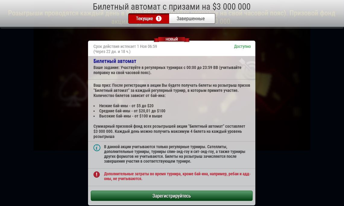 Также до 1 ноября на PokerStars действует акция «Билетный автомат» («Ticket Machine»). Каждый день рум будет раздавать по $50.000 билетами на турниры. Для участия в акции необходимо зарегистрироваться во вкладке «Задания» и сыграть как минимум один турнир с бай-ином от $5. Каждый день можно получить до 4 билетов. Розыгрыш проводится автоматически.