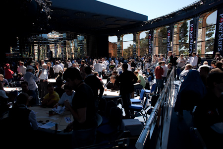 22:33 - Мы продолжаем вести репортаж с турнира. Игроки возвращаются с длительноо обеда, а коварные дилеры тем временем подняли планку блайндов до 300/600 фишек. В игре остается 270 игроков из 351 зарегистрированного.
