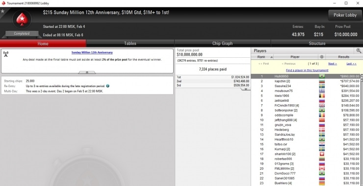 Ранее все юбилейные версии Sunday Million проходили с гарантией, которая превышала стандартную минимум в 5 раз. Последние три года Старзы устанавливали гарантию в $10 млн.