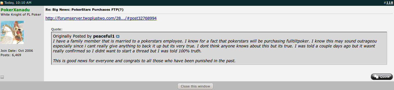 В данном посте говорится о том, что у человека есть родственник, который состоит в браке с сотрудницей PokerStars. Она сообщила ему, что информация о покупке FTP - чистая правда. В то же время становится не совсем понятно, каким именно боком ко всему этому относится не к ночи помянутый Лорен Тапи, который изначально должен был стать директором возродившегося рума.
