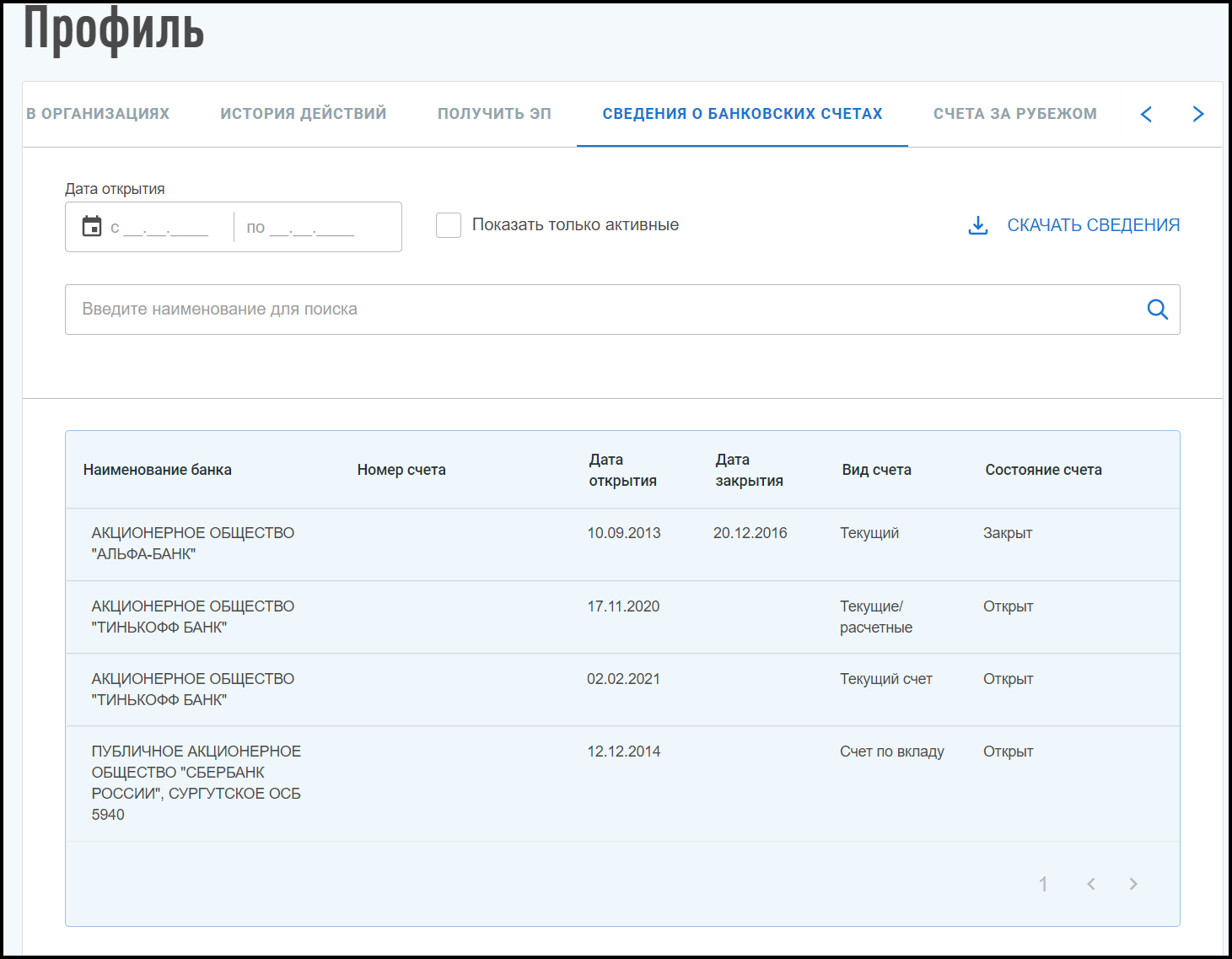 Из этого списка только пункты 1, 8, 9, 10 и 12 были законодательно добавлены в 2020 году — остальные либо находились под контролем с момента введения закона, как операции по банковским счетам, либо были добавлены в него в период с 2004 по 2010 годы. Более того — сведения о банковских счетах физлица отображаются в личном кабинете налогоплательщика с 2014 года. Чтобы найти их, нужно авторизоваться на сайте ФНС, нажать на свои ФИО в верхней части окна и найти в разделе «Профиль» вкладку «Сведения о банковских счетах». При этом никаких деталей, кроме названия банка, номера, вида и состояния счета, а также дат открытия и закрытия ФНС не отображает.
