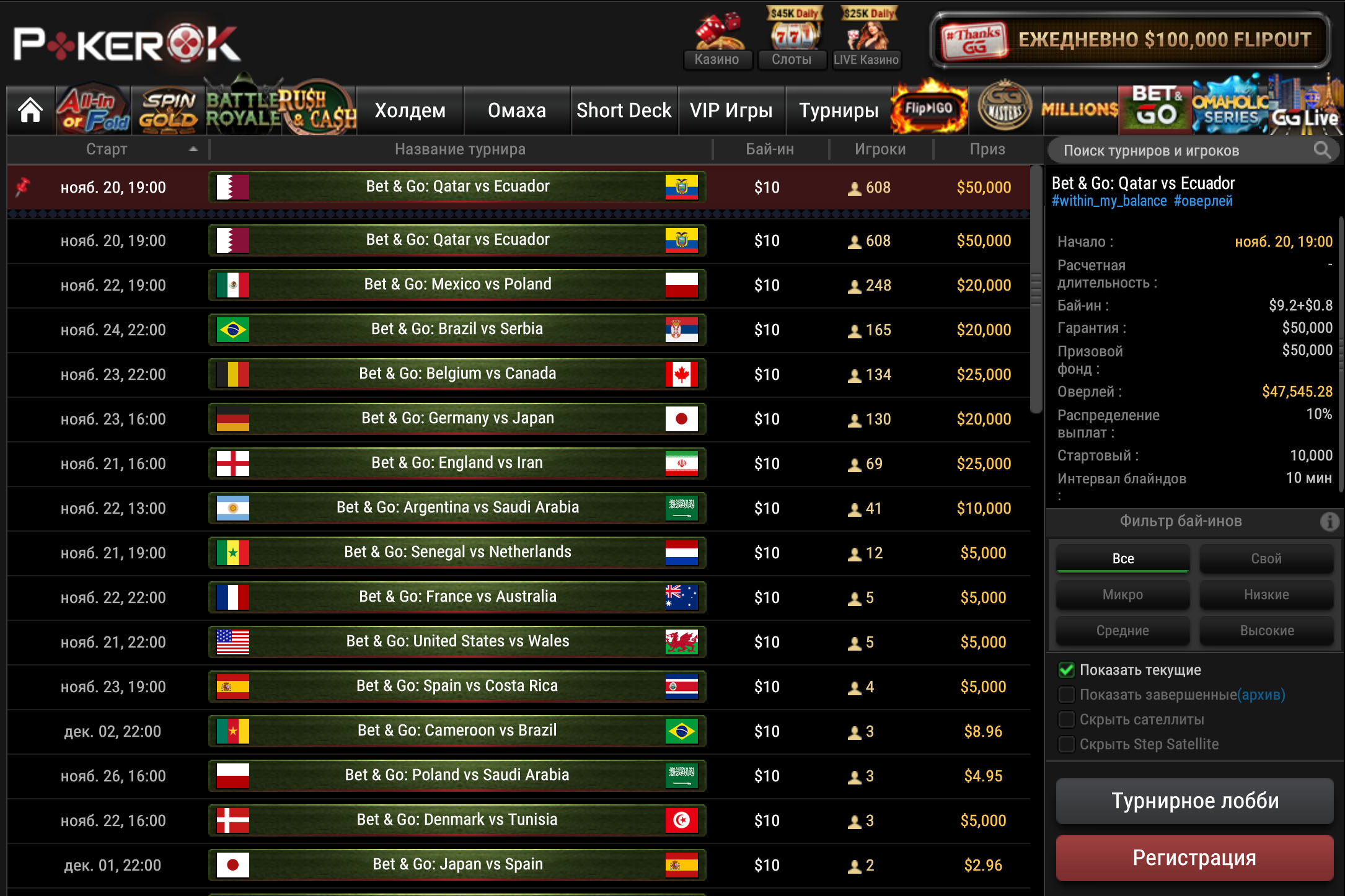 С 20 ноября по 18 декабря в Катаре будет проходить чемпионат мира по футболу. Специально к этому событию на ПокерОК появились новые МТТ Bet & Go.