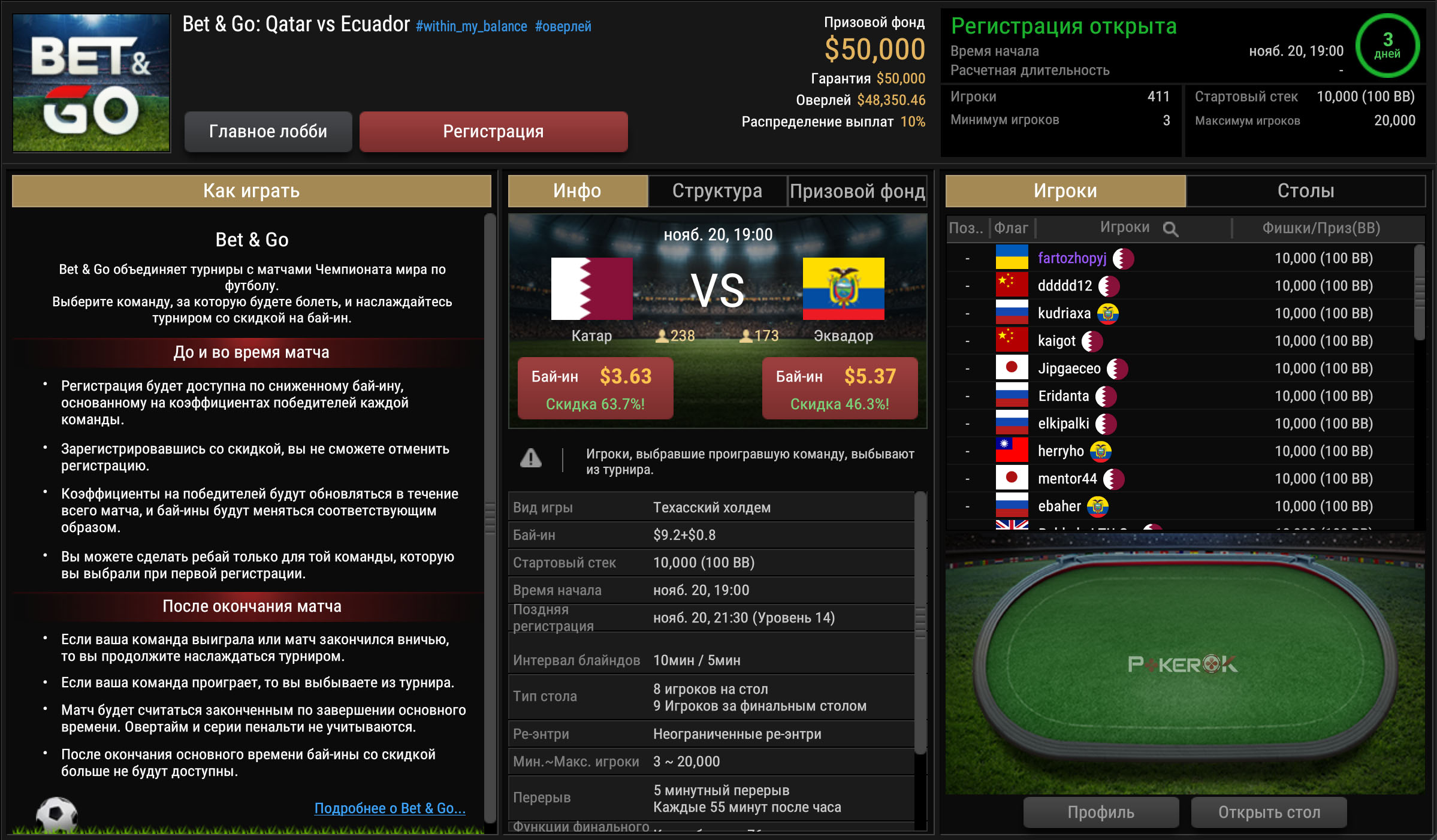 Сначала игрок выбирает турнир. Например, $10 Bet & Go: Qatar vs Ecuador, и команду, которая победит в матче. Если игрок выбирает Катар, то регистрируется в турнире за $3,63. Если Эквадор — за $5,37.