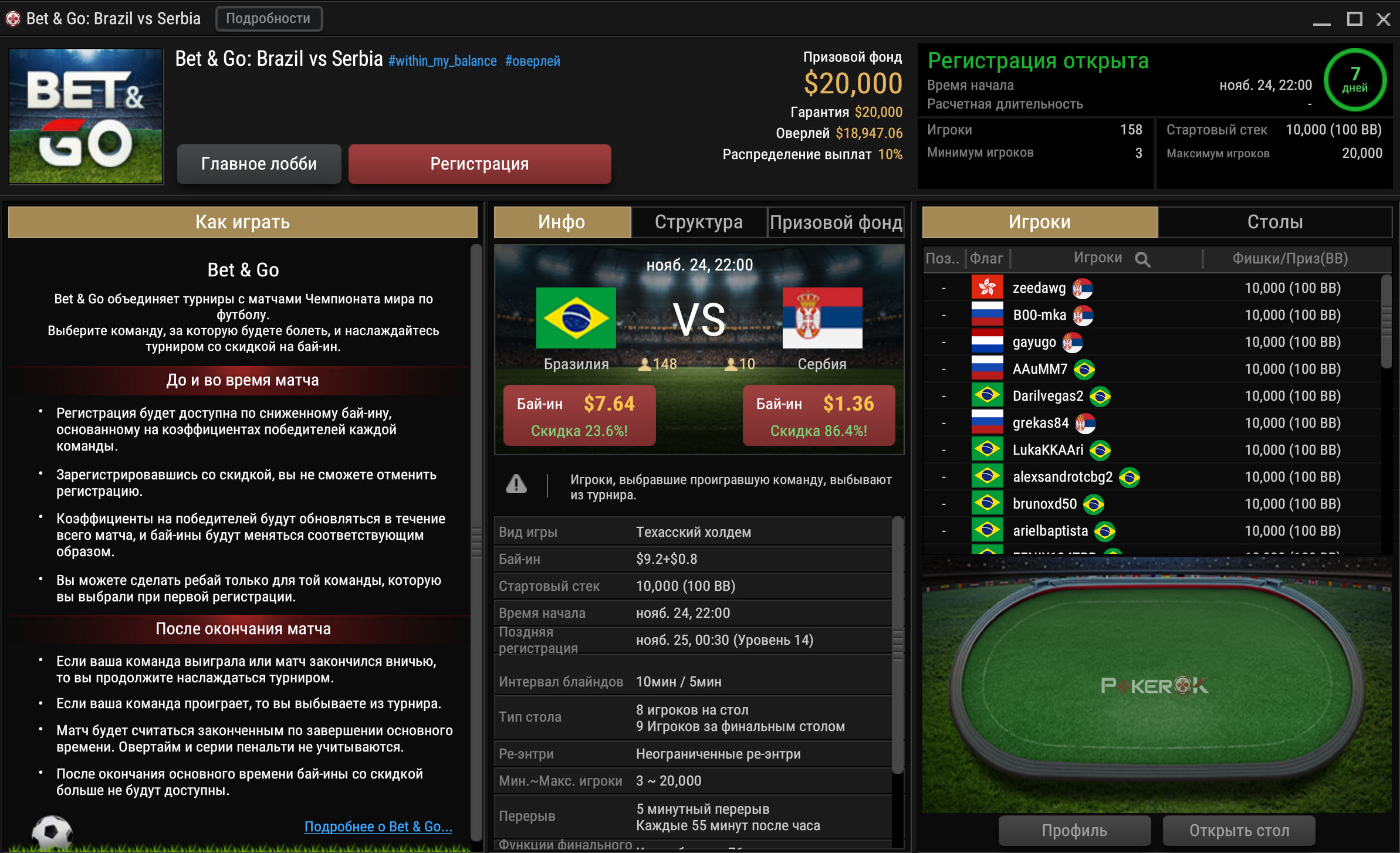 Если выбираете Бразилию, бай-ин = $7,64. Если Сербию — $1,36 (скидка 86,4%). Бразилия считается большим фаворитом в этом матче: на её победу принимаются ставки с коэффициентом х1,47. На Сербию — х7,18.