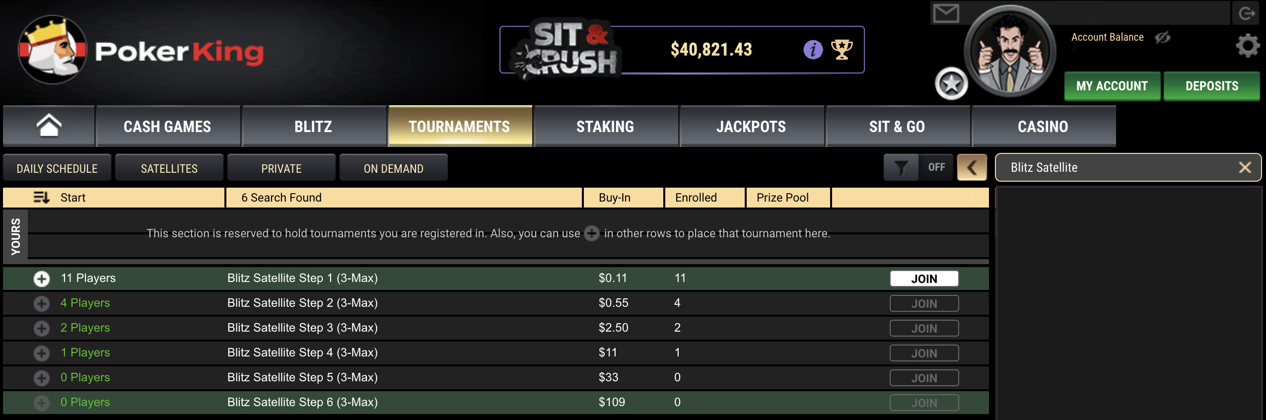 - Freeroll → $1.10 → $11 → $109 Satellite
