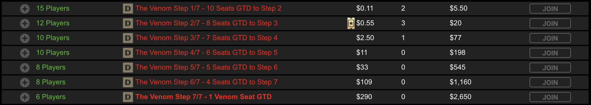 VenomFever — прямые сателлиты на Веном, в которых разыграют 717 билетов. Бай-ины от $32 до $630. Гарантии от 1 до 60 билетов.