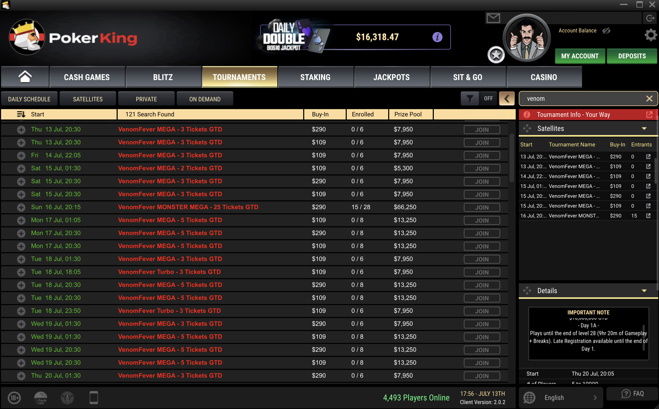 - Freeroll → $2.50 → $33 → $290 Satellite