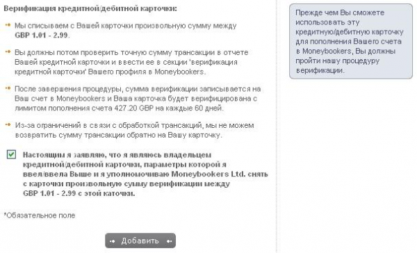 После ведения данных о карточке/карточках Skrill снимет произвольную сумму от 1,01 до 2,99 (в зависимости от валюты счета Moneybookers). Тебе необходимо обратиться в свой банк, либо посмотреть в интернет-банке, какая сумма была снята с твоего счета. Эту сумму необходимо указать на сайте Skrill, тогда карточка будет подтверждена.