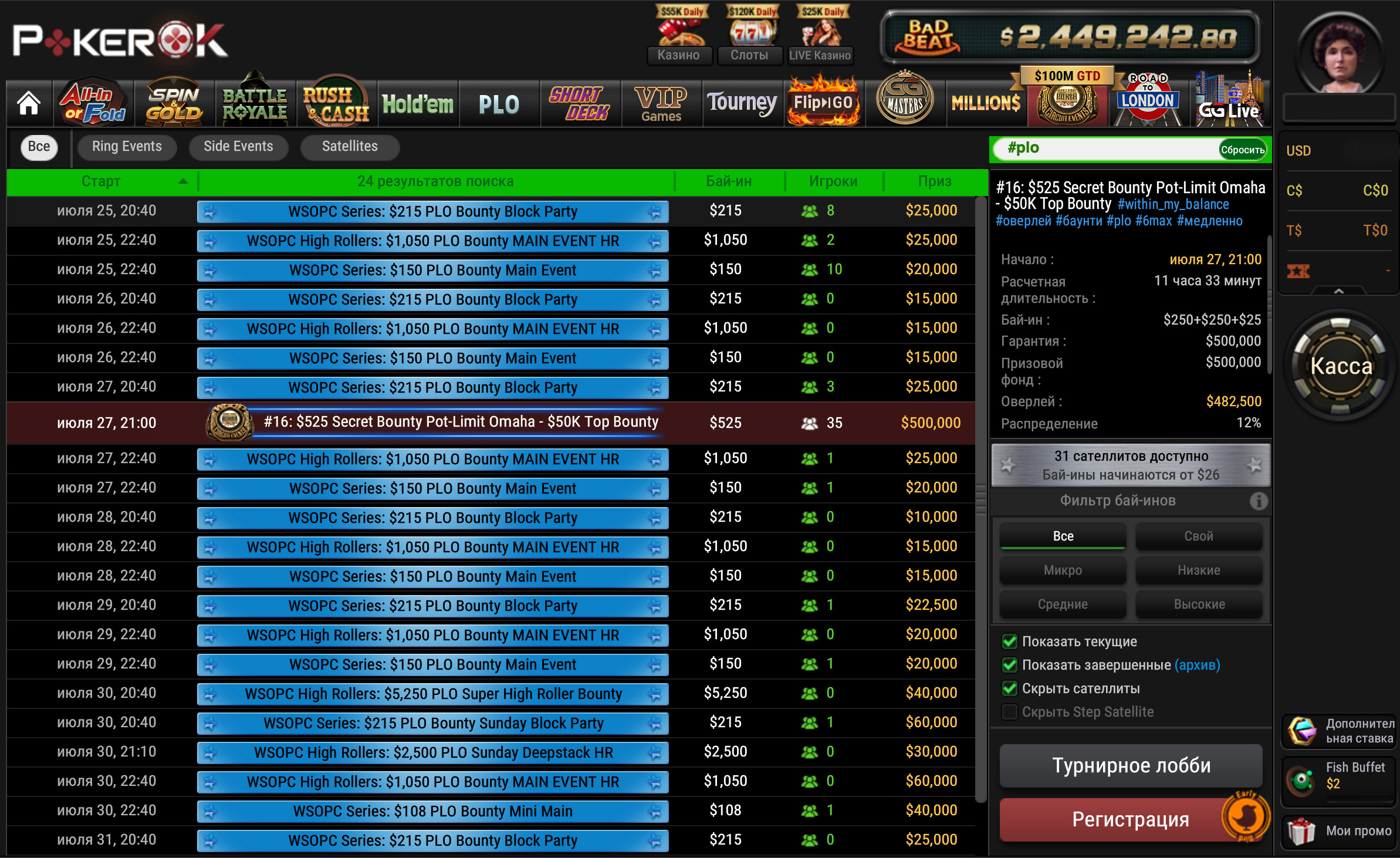 На время WSOPC в расписание добавлены турниры по Омахе с бай-инами до $5,250. Когда серий нет, на ПокерОК проходят турниры с бай-инами до $525 включительно.