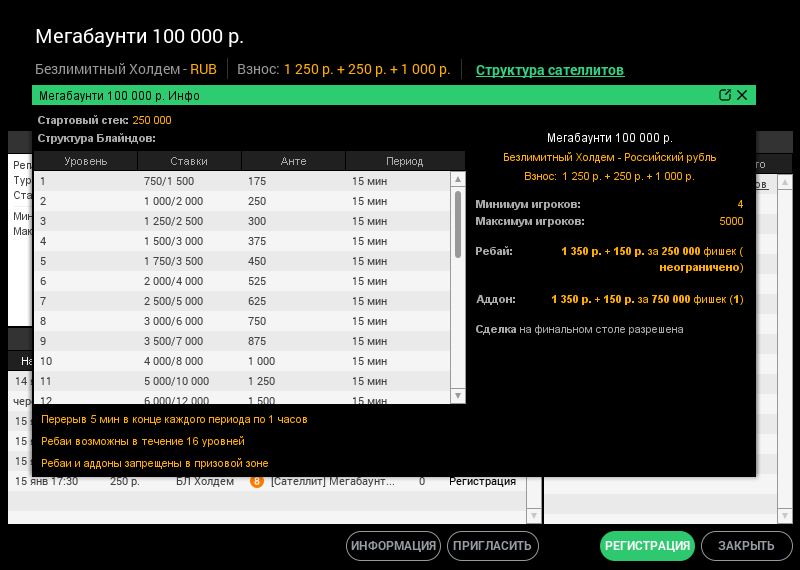 Например, на Покердом проходит турнир 2.500 ₽ Мегабаунти (100.000 ₽ гарантия). Стартовый стек 250.000, уровни по 15 минут, поздняя регистрация 16 уровней (4 часа). При этом, если зайти на последнем уровне поздней регистрации, сделать ребай и адд-он, то вы получите стек в 1.250.000 фишек (50 бб).