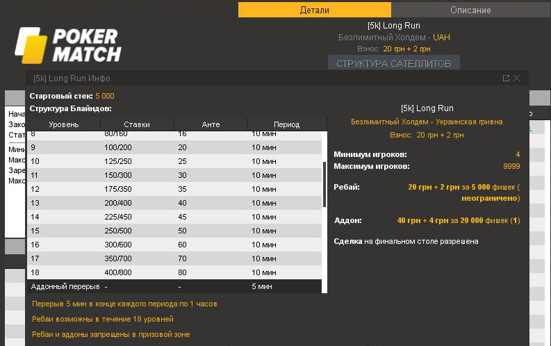 Турниры с похожей структурой можно встретить на PokerMatch. Например, в турнир 22 грн. Long Run [5k] можно зайти на последнем уровне поздней регистрации (спустя 3 часа после начала турнира), сделать ребай и адд-он и получить стек в 30.000 фишек (33,3 бб).