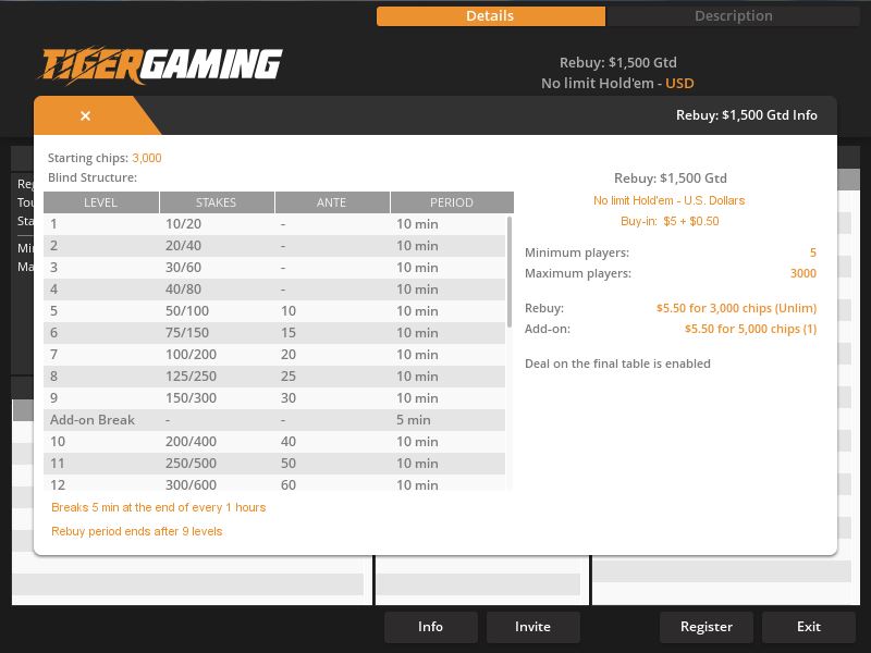 Аналогично на TigerGaming есть турниры, например $5,50 Rebuy ($1.500 GTD), в котором полтора часа поздней регистрации. И если зайти на последнем уровне, сделать ребай и адд-он, то можно получить стек в 27,5 бб.