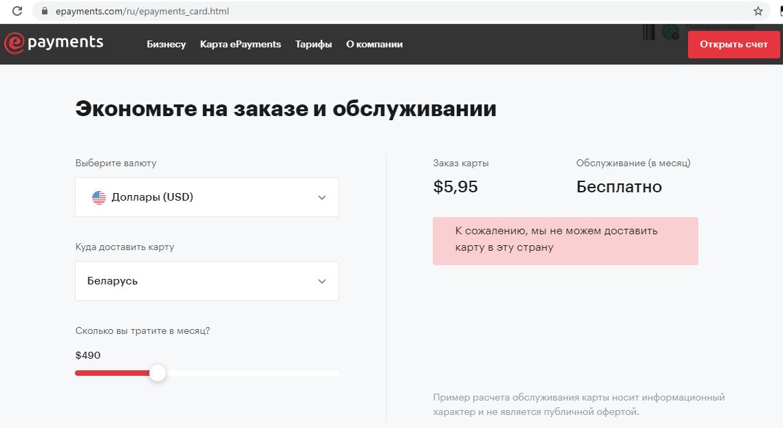 Главная фишка, почему пользователи выбирают ePayments, это Mastercard. Компания отправляет физические карты Mastercard по всему миру. До недавнего времени ePayments доставляли карты в Беларусь и Россию, однако сейчас при попытке заказать карту на сайте появится объявление: «К сожалению, мы не можем доставить карту в эту страну».