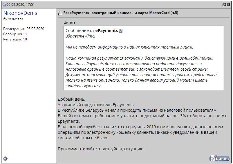 На этот вопрос представитель ePayments не ответил. Затем сообщение перекочевало на другие форумы (onliner) и Телеграм-каналы, чем вызвало резонанс.