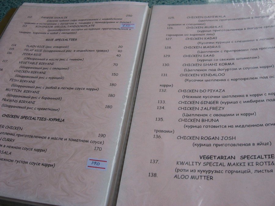 Далее цены на другие блюда идут от 100 до 200 батт.