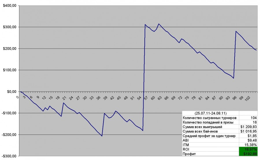В связи с окончанием лета, весь состав команды решил разъехаться и отдохнуть недельку другую. В результате этого, нашей командой было отыграно очень небольшое количество турниров. Несмотря на это, мы отыграли в очень небольшой плюс. Нам удалось занять топ1 в турнире за 11$ на 187 человек(504,90$) и топ4 в турнире за 11$ на 330 человек(231$). Как всегда у нас было два 11 места два 14 и ещё одно 4 место в небольшом турнире(119,14$). Если говорить коротко, это месяц получился проходным. С началом нового учебного года, мы возвращаемся обратно в университеты и уже приступим к игре в гораздо большем объёме. В наших планах, как можно быстрее набрать сумму в 6000$ и подключить новый лимит 20$.