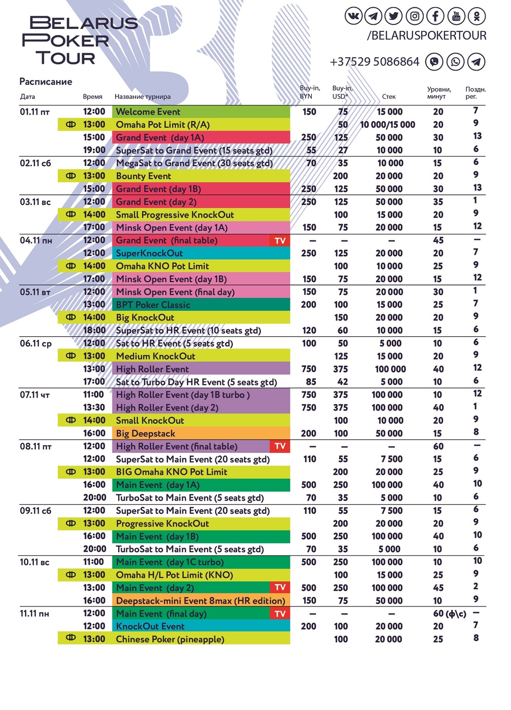 *примечание: 20, 27, 31 октября Freebuy to BPT HighRoller Step 1 начнётся в 10:00 и 11:00, BPT HighRoller Step 1 — в 14:00, BPT HighRoller Step 2 — в 17:00.