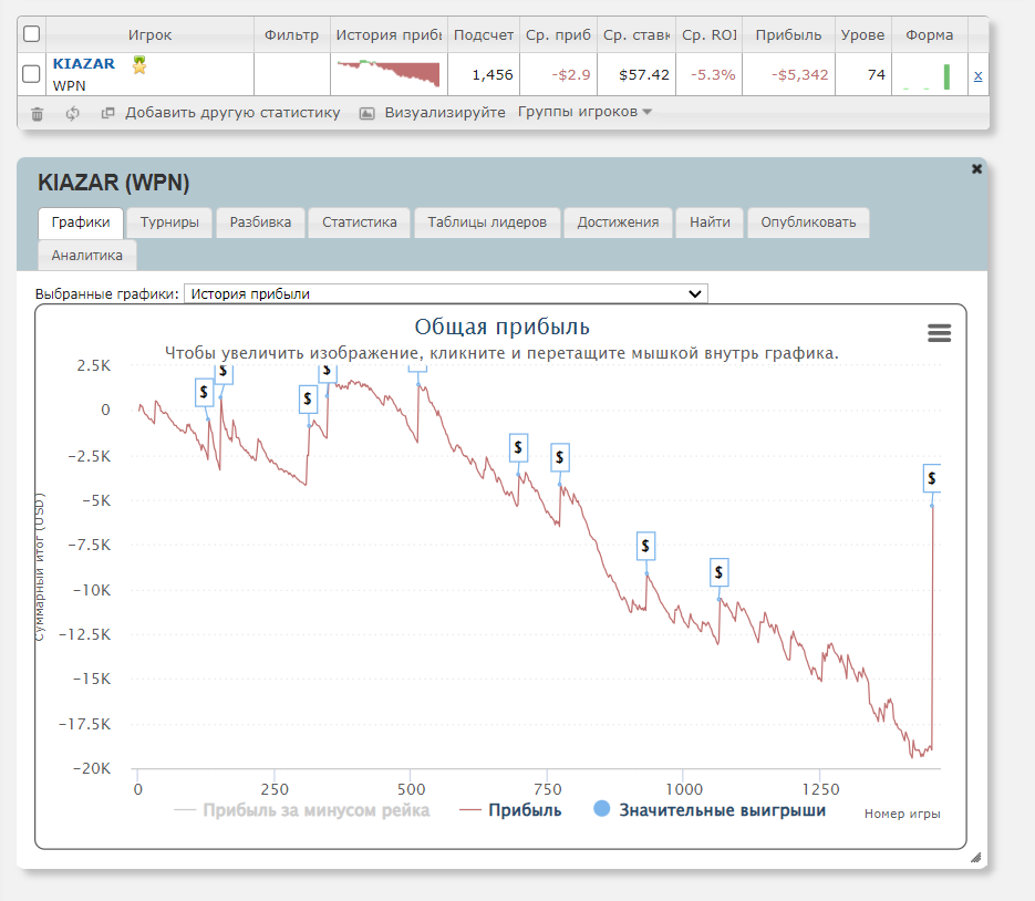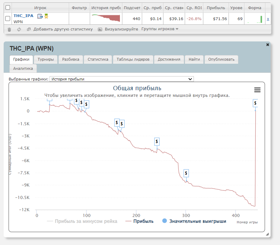 Его статистика на SharkScope почищена и показывает данные только с марта 2021, но график всё равно примечательный: 439 турниров ABI$40 подряд он опускается вниз до $11,6K и отлетает как раз на выигранном турнире Hi5.