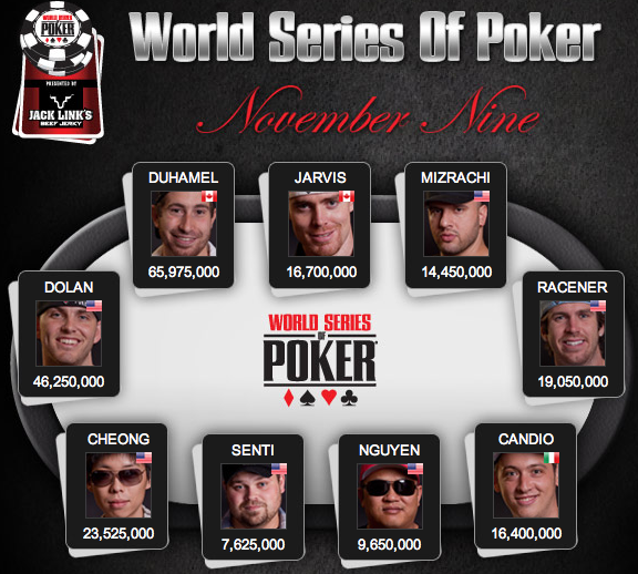 За эти месяцы финалисты WSOP «November Nine» стали главными звездами в мире покера. О них писали все ресурсы, многие брали у них интервью и даже крупные телеканалы США приглашали их в разнообразные шоу. Кто-то из них станет обладателем главного приза в $8,944,138, то есть одного из самых крупных во всей истории покера.