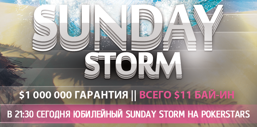 Юбилейные килополя на PokerStars уже давно стали традицией и сегодня очередные несколько тысяч человек бросятся в бой за право урвать солидный куш, внеся всего $11 бай-ина. Sunday Storm - пиханина, викторина и проверка на нервы как для любителя, так и для профессионального игрока в покер. Ночь, которая может изменить жизнь или испортить настроение перед началом новой недели. $1 000 000 старзы гарантировали, но наверняка эта цифра в очередной раз будет бита. $100 000, и это минимум, заберет победитель всего действия. Возможно, а сегодня это действительно возможно, именно сегодня кто-то из посетителей нашего сайта сделает один из самых запоминающихся выстрелов в своей карьере. Ну а мы, как и обычно, редакцией Pokeroff попробуем стать этими счастливчиками, ну или хотя бы просто поболеем за наших игроков.