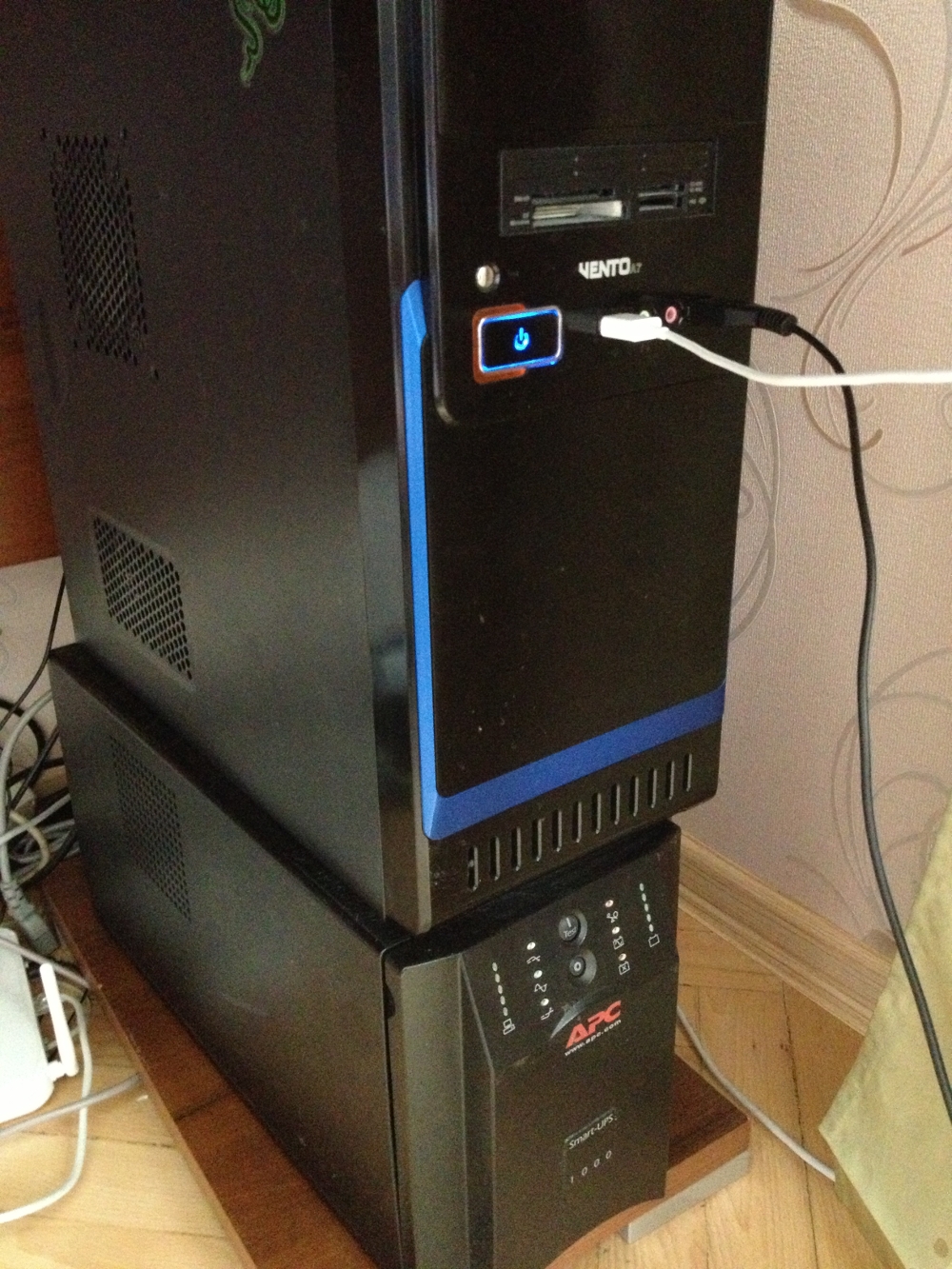 NL_Profit: Под обычным системником стоит бесперебойник. Купил его давно. Эта сволочь весит около 15кг. Пригодиться он мог всего один раз, но именно в тот раз он был неподключен после переезда :) В данный момент в нём сел аккумулятор, так что стоит он просто "для мебели", надо будет заменить.