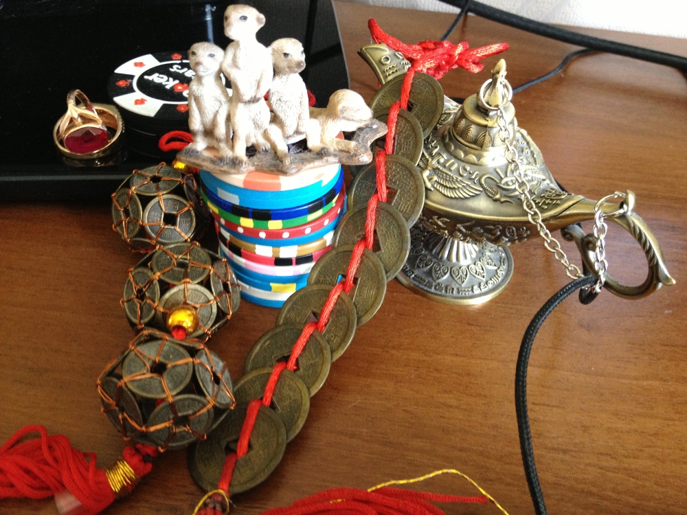 Перейдём к более любопытным штукам. Внимательный читатель наверняка заметил на первом фото множество мелких вещиц на подставке левого монитора. При ближайшем рассмотрении мы можем увидеть эдакий импровизированный "уголок покерной ауры":