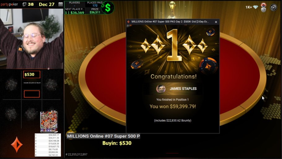 Канадский стример и амбассадор partypoker получил за победу $59,399 с учётом баунти. Эта сумма — бесткеш в карьере Джейми, причём предыдущий рекорд он поставил в этом же году и тоже на MILLIONS Online, получив $35K за дипран в Main Event.