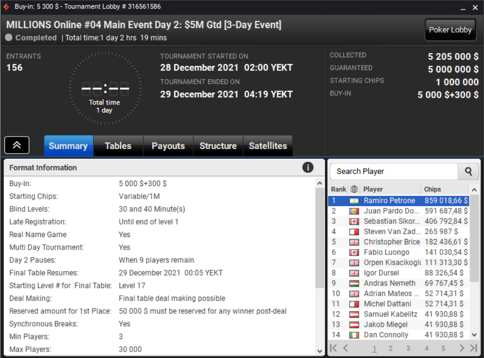 Эта победа стала самой крупной в карьере Рамиро Петроне. До этого его бесткеш был $282K за второе место Главного события Turbo Series 2018 на PokerStars. Его общие призовые в онлайне теперь превышают $12M.