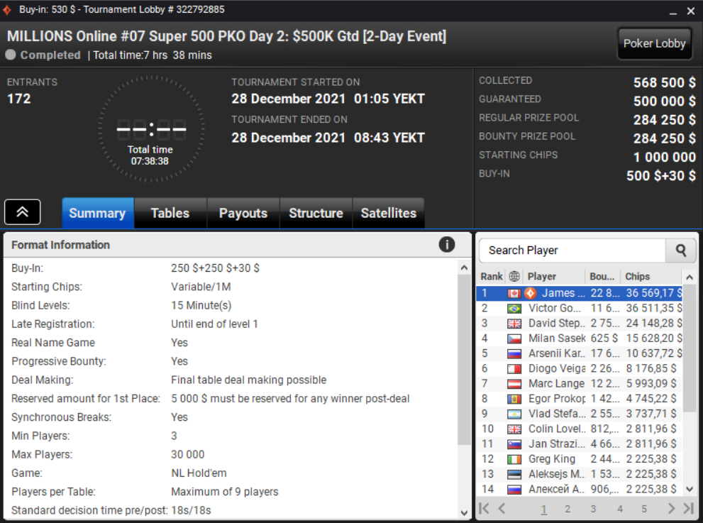 29 декабря Lena900 выиграл, вероятно, первый крупный чемпионский титул на partypoker в 2021 году. Хайроллерский турнир собрал 171 вход, а до финального стола дошли несколько всемирно известных игроков, включая Константина Маслака, Виктора Устимова и чемпиона WSOP 2020 Дэмиана Саласа.