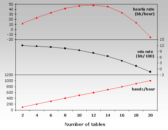 Суть в том, чтобы одновременно играть за таким количеством столов, при котором ваша почасовка будет максимальной. По мере того, как вы научитесь принимать более быстрые решения и освоитесь с одновременной игрой на нескольких столах, ваше оптимальное число столов будет повышаться. Если же вы сядете за игру не в форме, то это число может существенно снизиться (в этом случае даже одного стола может быть много).