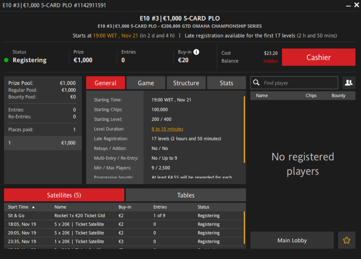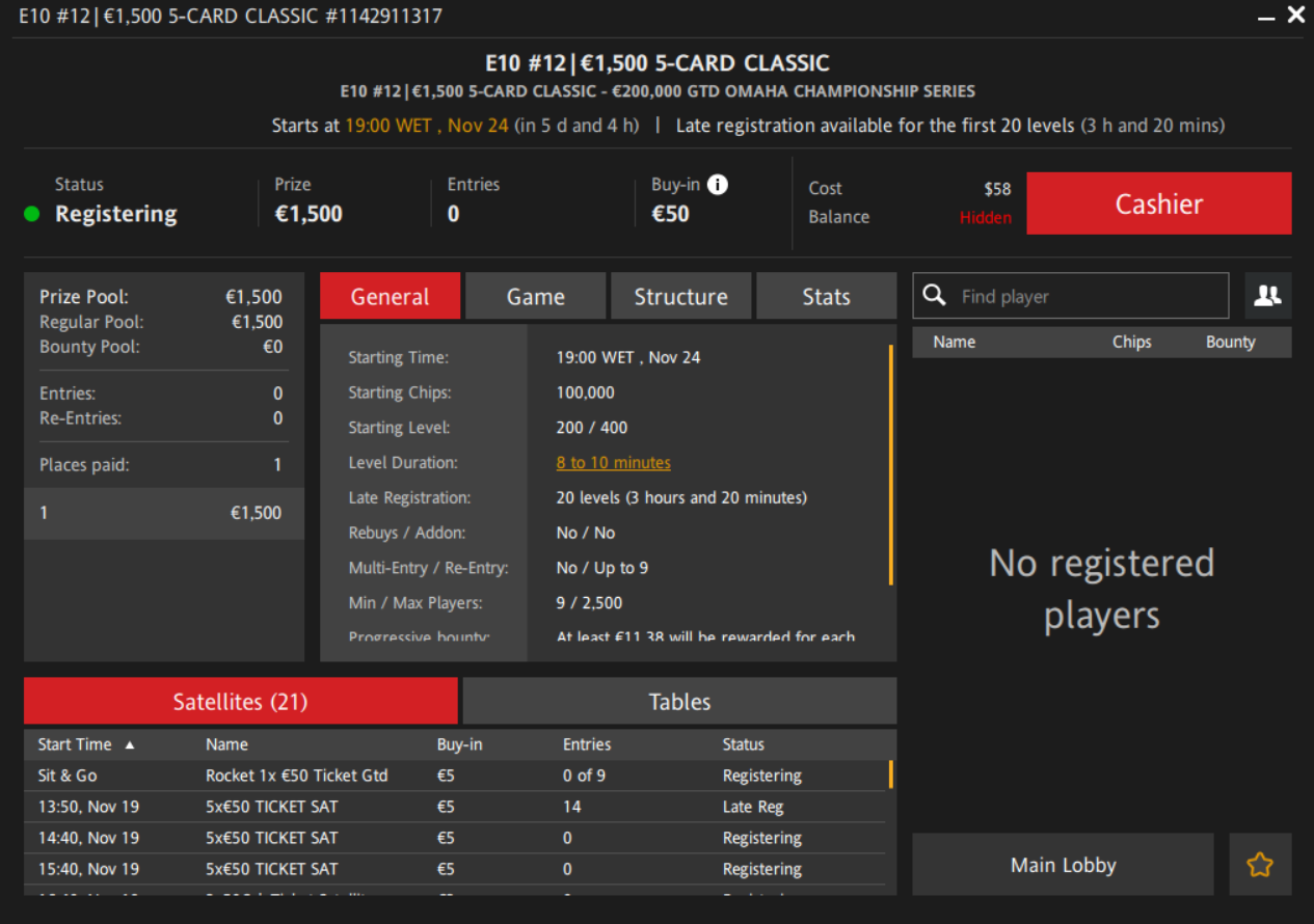 Omaha Championship Series проходит в сопровождении лидерборда, в котором игроки могут получить турнирные деньги до €1,000 и билеты номиналом до €250.
