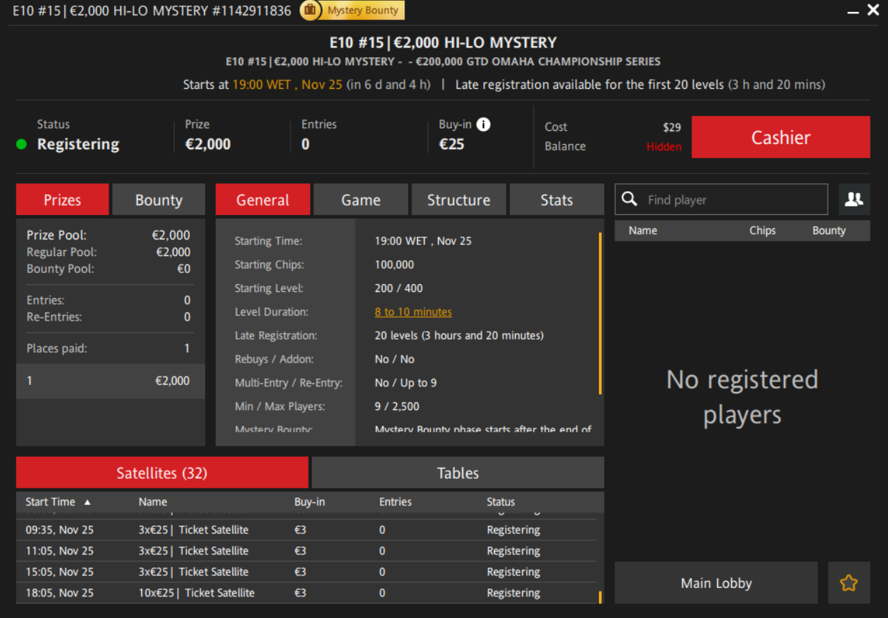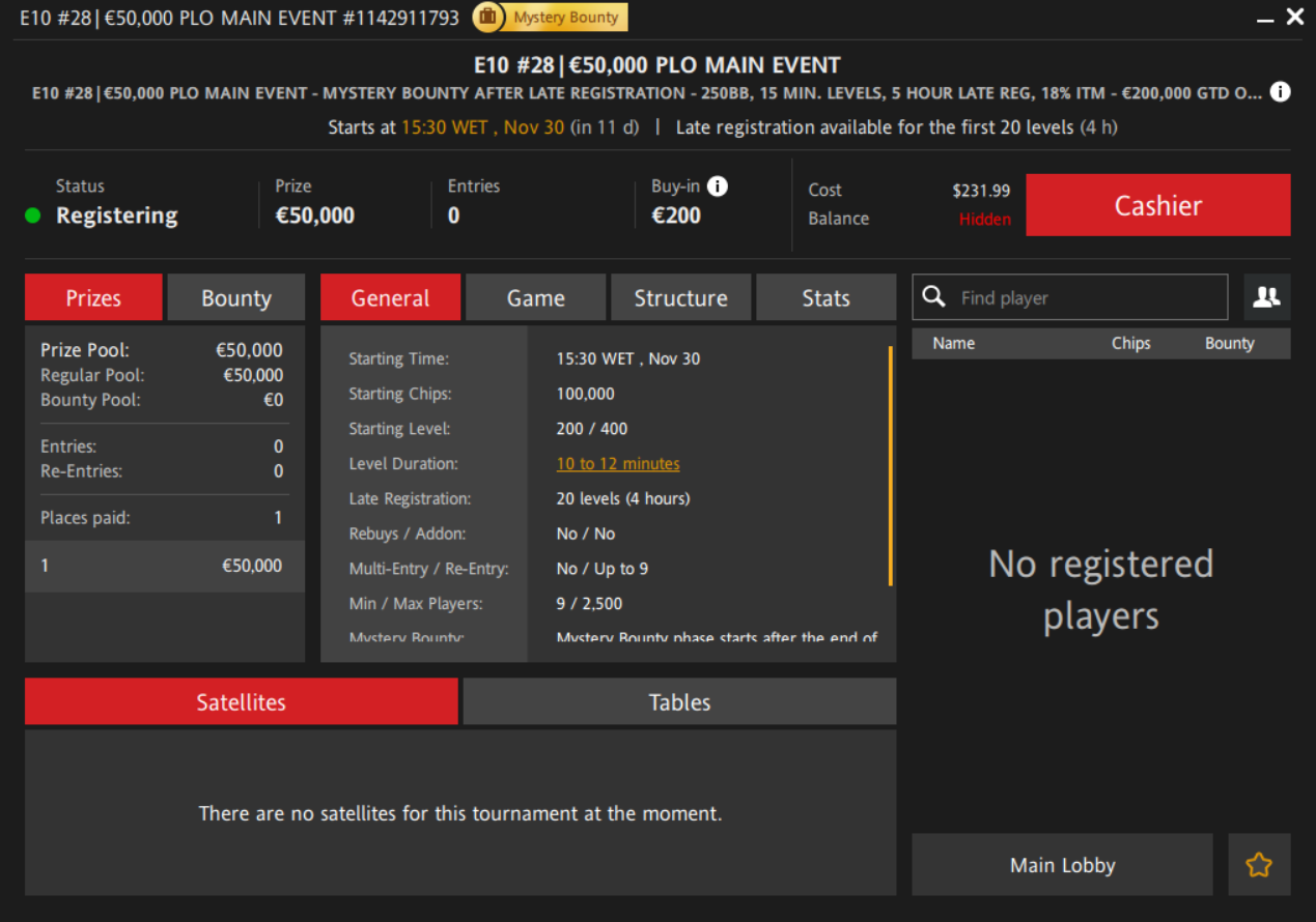 В сателлит для Main Event можно попасть бесплатно, выполнив с 21 по 30 ноября миссию Revenue по набиванию 5,000 очков (€500 рейка) в любых играх рума. Выполнить миссию можно один раз за указанный период.