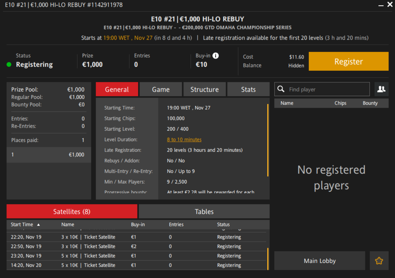 Пот-Лимитная Омаха Хай-Лоу представлена на серии тремя турнирами: