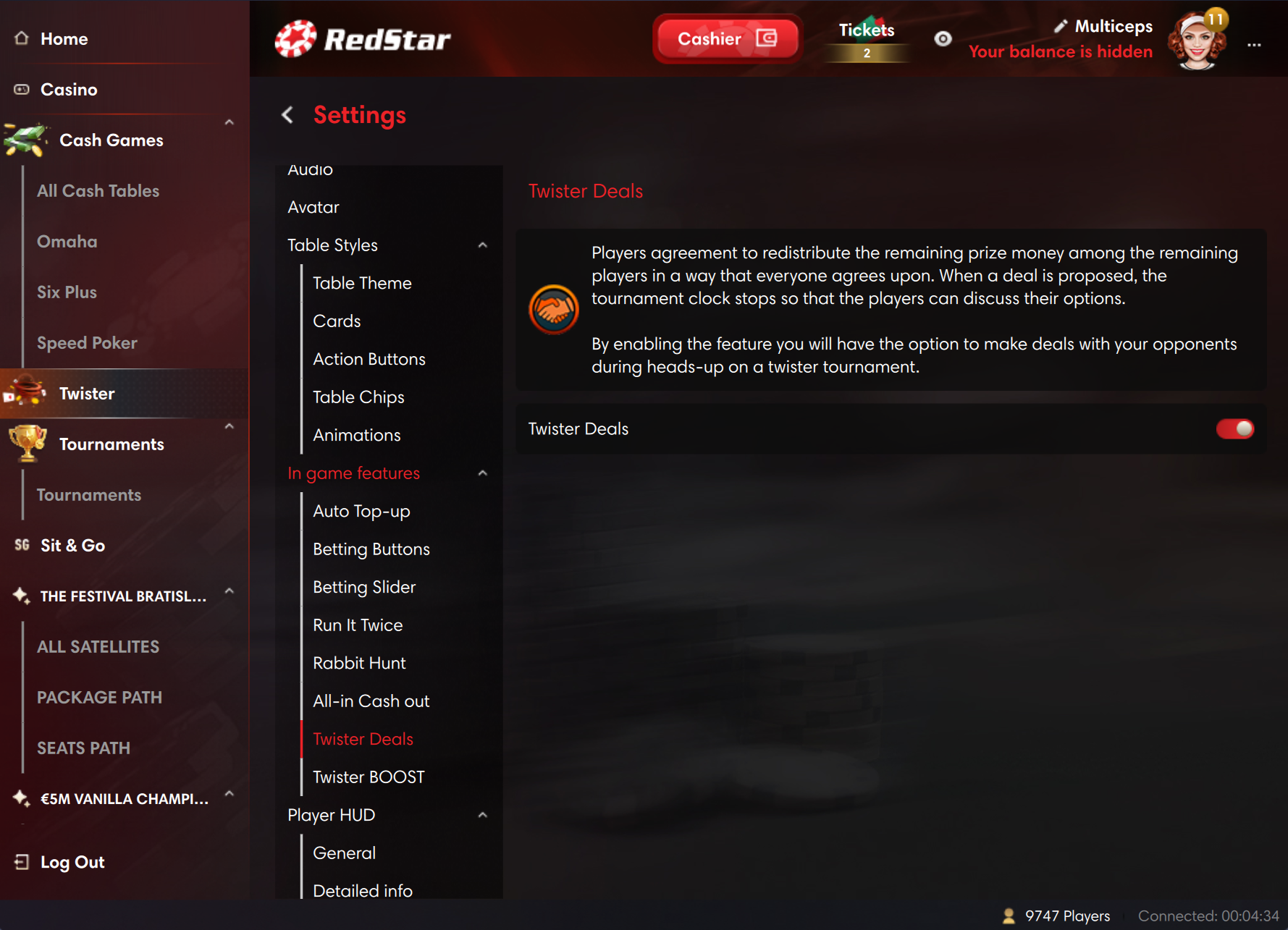 На момент запуска функции сделка была доступна только в Classic NLH Twister — это 14 турниров с бай-инами от €0.25 до €200 и множителями от х2 до х1,000.