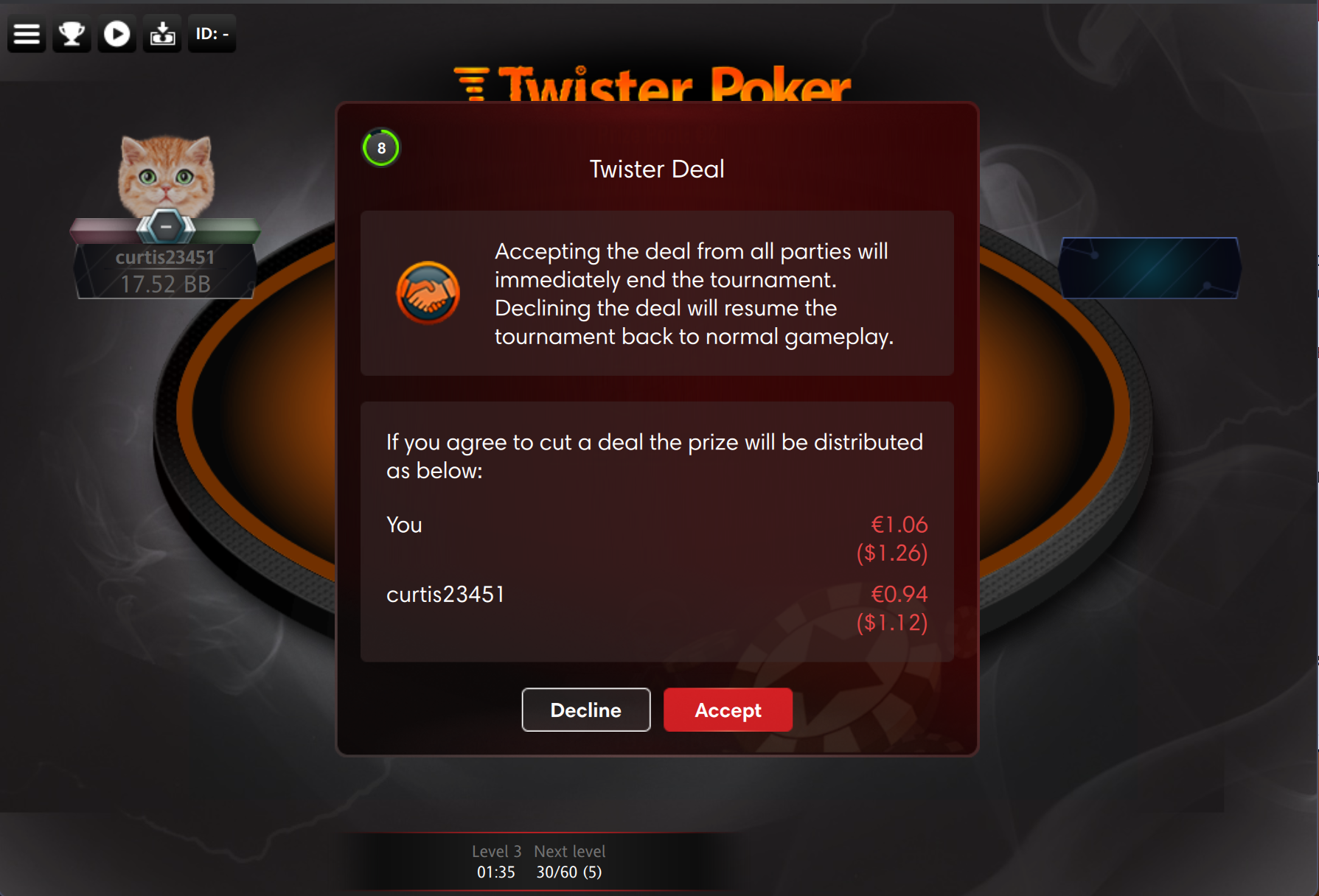 Когда оба игрока согласны посмотреть на условия сделки — обсуждения как такового нет, вы просто смотрите на разделение выплат пропорционально вашим стекам и решаете, согласны или нет — игра встаёт на паузу и вам показывают информационное окно для принятия решения в течение 10 секунд: