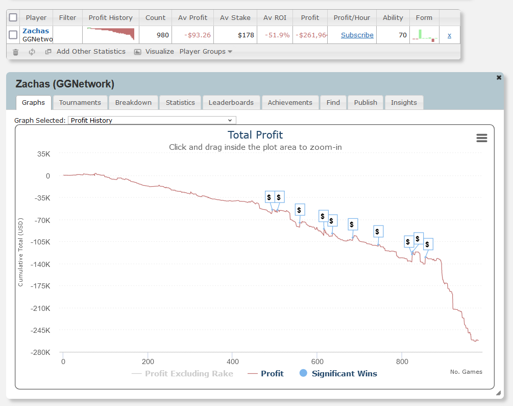 Кстати, всего в турнирах «Zachas» летит вниз почти на $262K за 980 МТТ ABI$178.